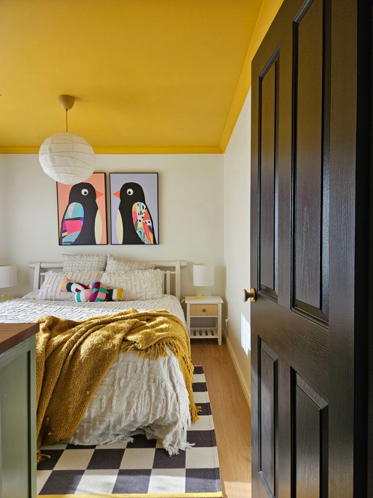 In our guest bedroom, we painted our ceiling a mustard yellow and kept the walls white, while in our master bedroom, we have a black ceiling and white walls.