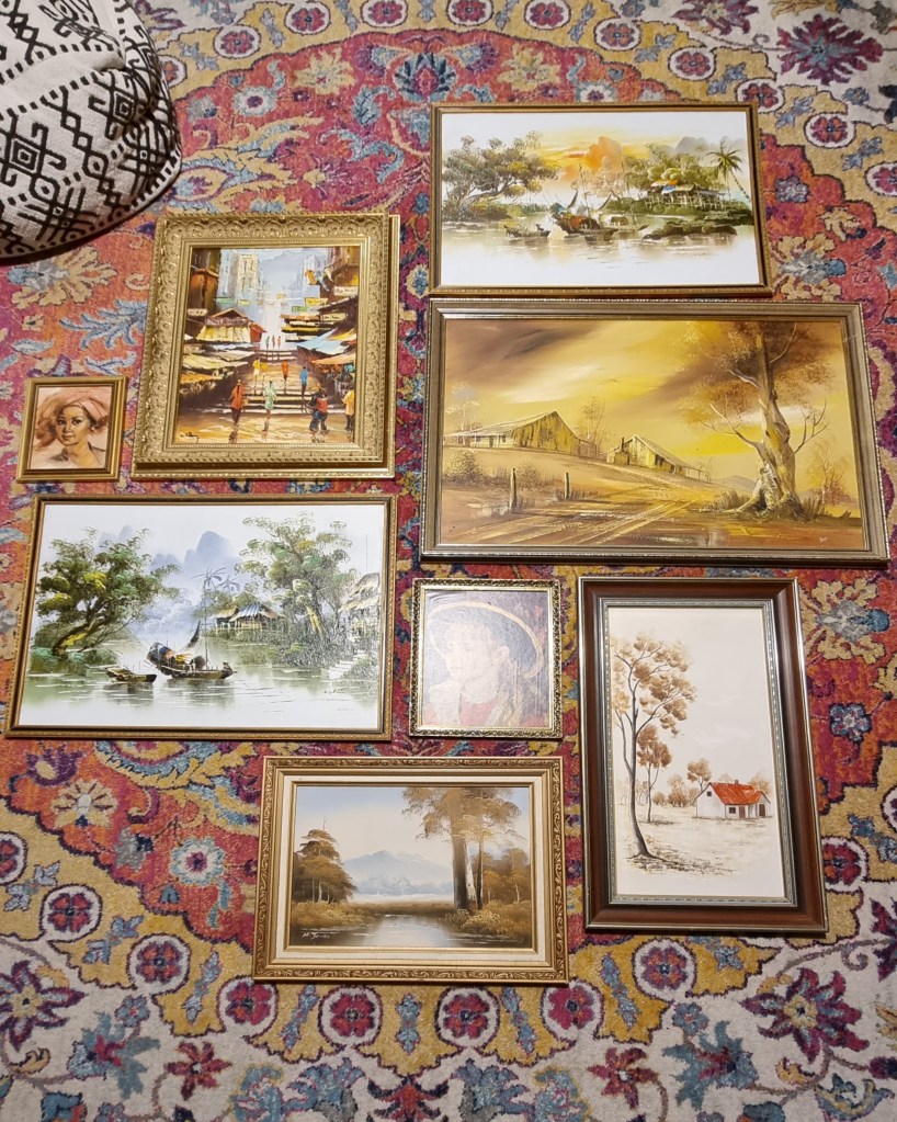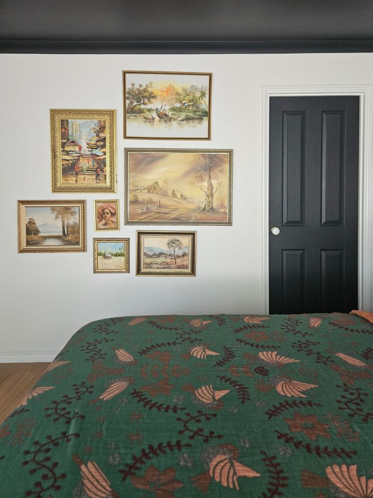 I’m a big fan of gallery walls, so I decided to hang a vintage gallery wall here with artwork slowly collected from secondhand stores and vintage markets.