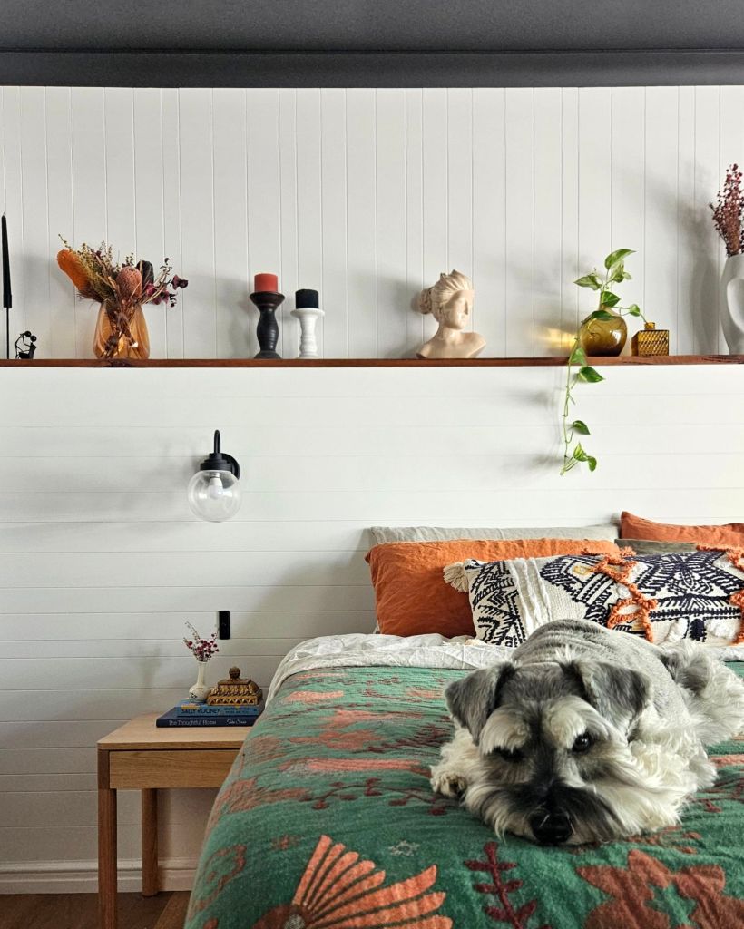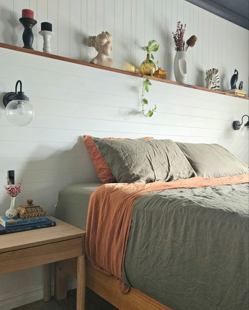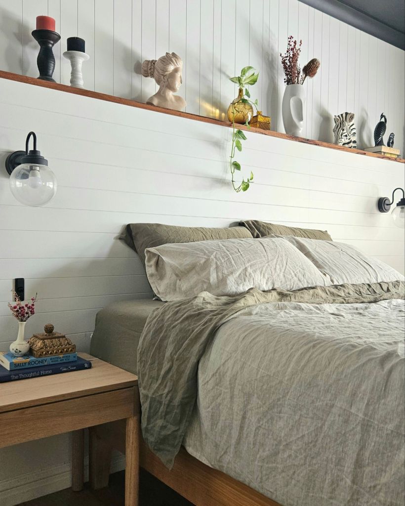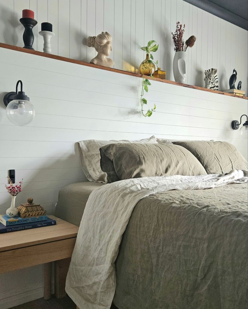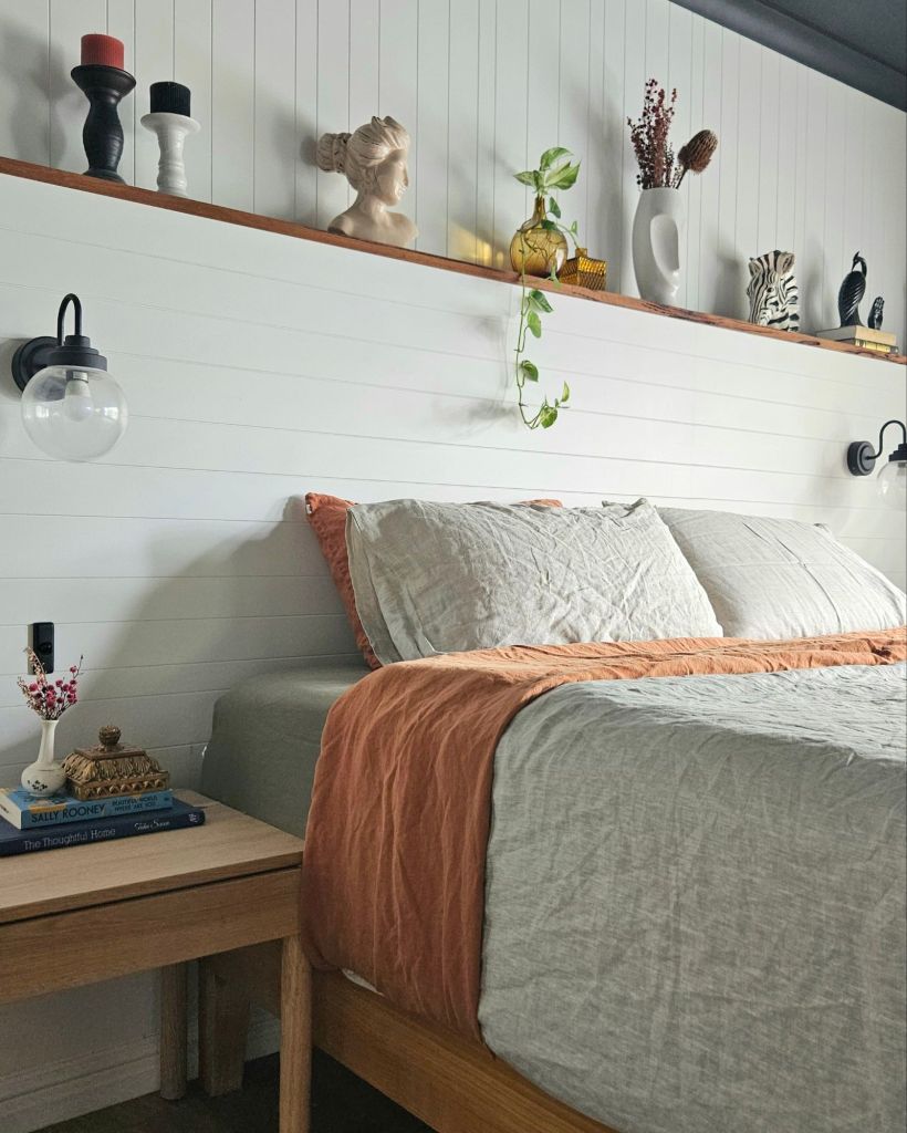 Instead of having a bed with a headboard, we decided to cover up that wall with a built-in bedhead with a ledge to display some of our treasures.