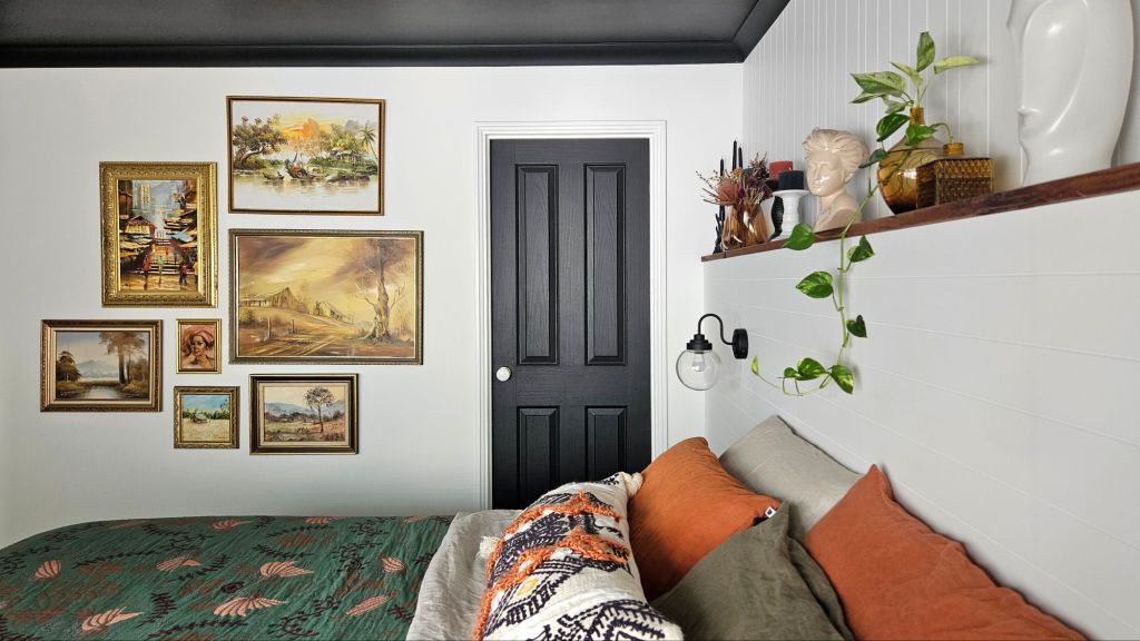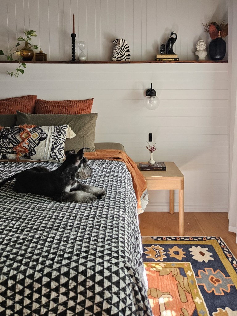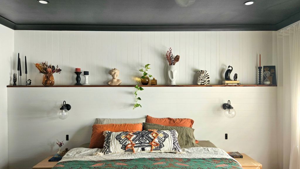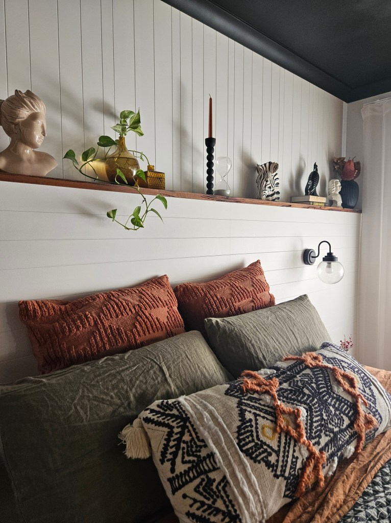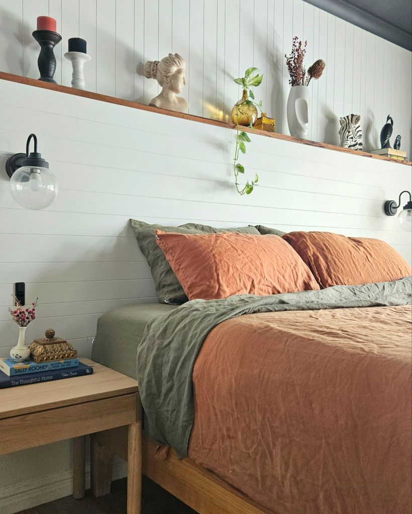 Instead of having a bed with a headboard, we decided to cover up that wall with a built-in bedhead with a ledge to display some of our treasures.