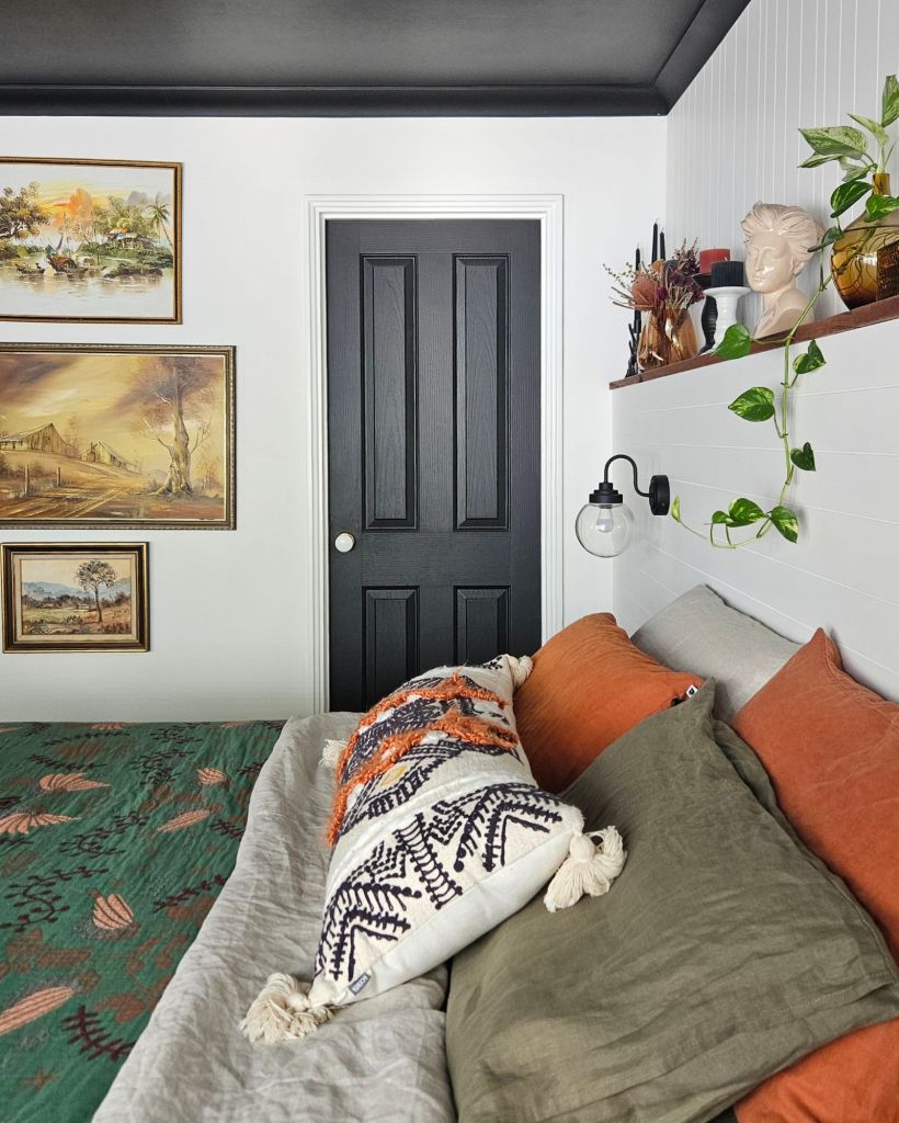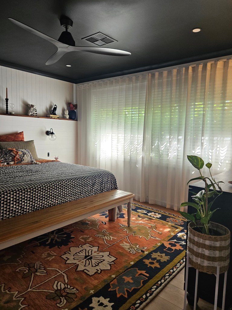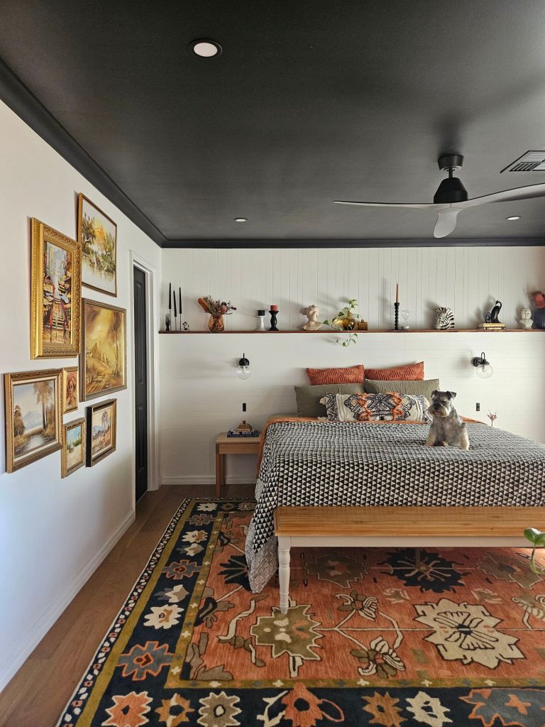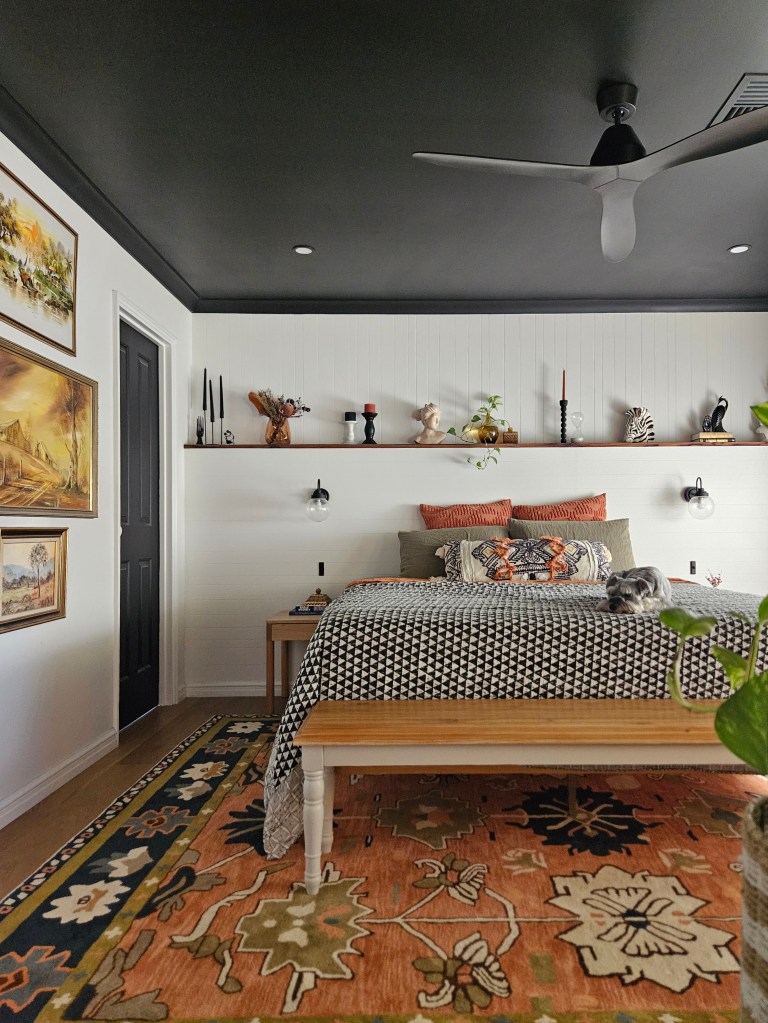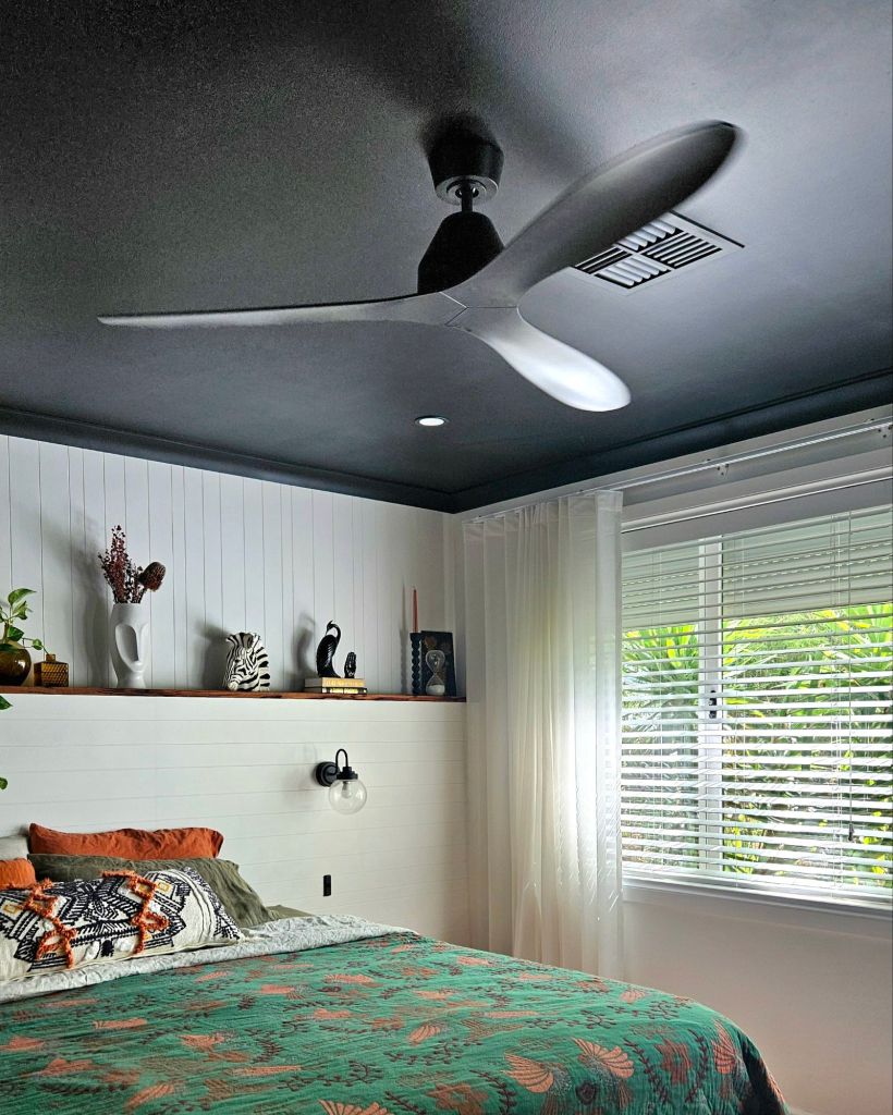 I have no regrets painting our ceiling black! 🖤 Had it been white, the room just wouldn’t make the statement it does. I think any other bold colour would work too, but we knew we were going to have a ceiling fan so black made the most sense since it’s virtually camouflaged and doesn’t demand attention.