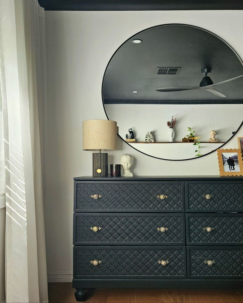 I love that the dresser repeats the black from the ceiling and adds texture via the paintable wallpaper.