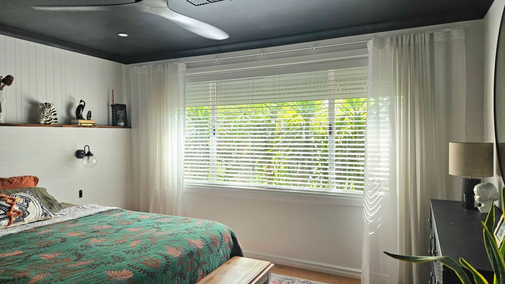 We installed floor-to-ceiling, wall-to-wall sheer white curtains from Blinds Online. Hanging your curtains floor to ceiling gives the illusion of higher ceilings, and installing them wall to wall has the same effect width wise.