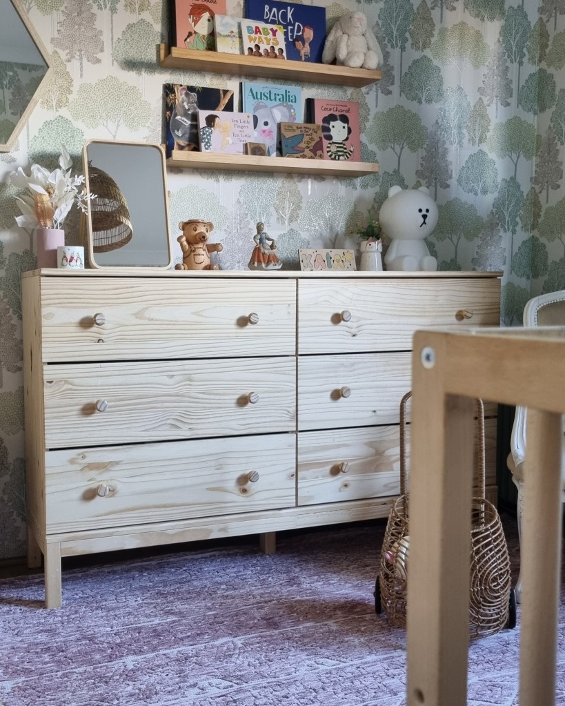 Turns out we already had a good-sized dresser (the raw pine IKEA Tarva dresser) in our nursery, which was very generous in size for baby and toddler clothes. Kaia was about to move into her big girl bedroom, and it wasn’t going to fit in that room anyway so we decided to repurpose it for our room.