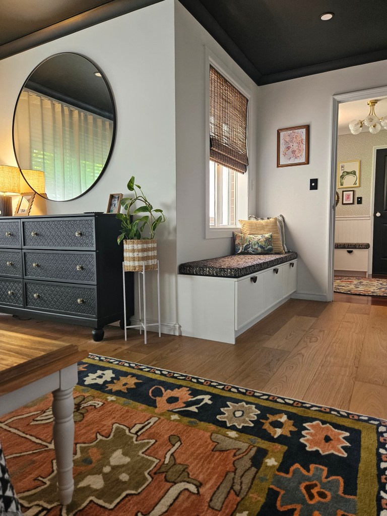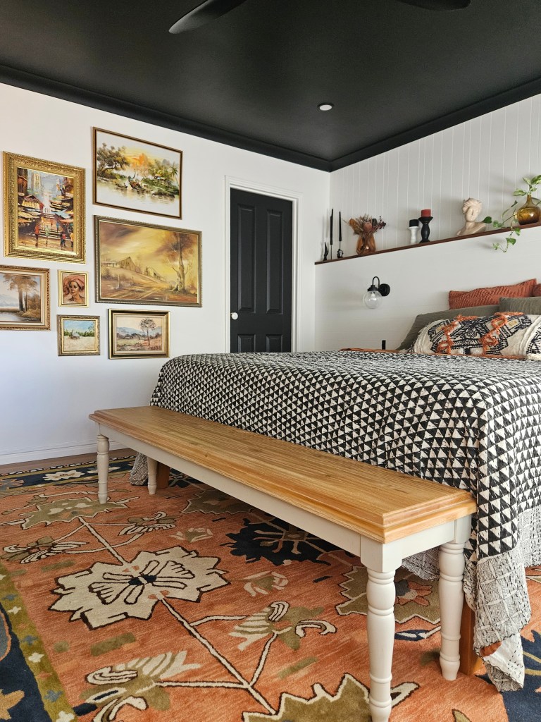 I’ve always loved the high contrast of black and white, so this space is so satisfying to me. I love that I can change up the vibe of the space with the bedding and the rug if I wanted to – I could easily ditch the earthy colours and go bright since the bones of the space are quite neutral.