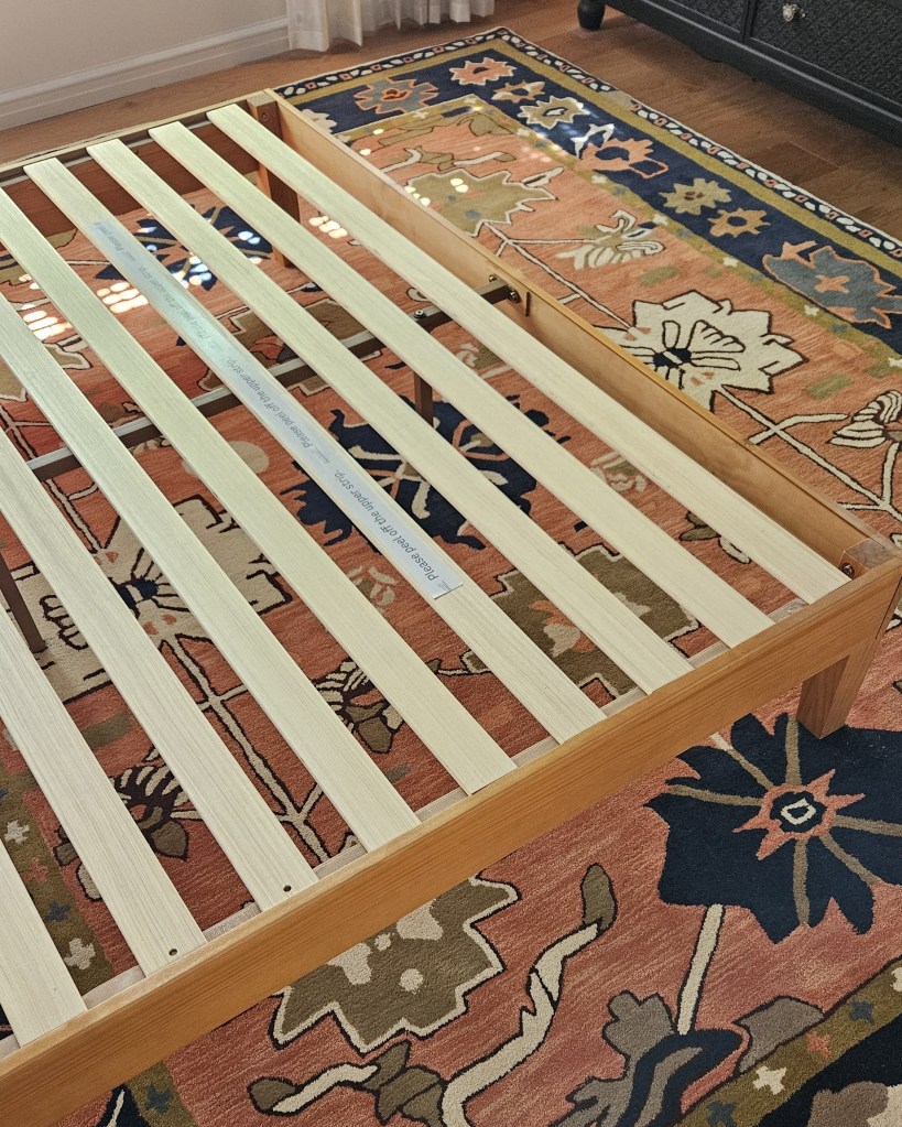 Since we have the new built-in bedhead, we didn’t really want a bed frame with a headboard, so we went hunting for a timber bed base.