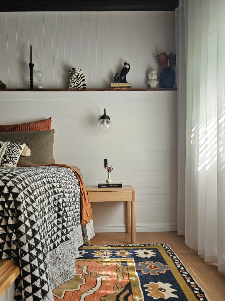 Since the room is mostly black and white, we rely on soft furnishings like the bedding and rug to add warmth and colour. I love that I can completely change the vibe of the space just by switching up the bedding.