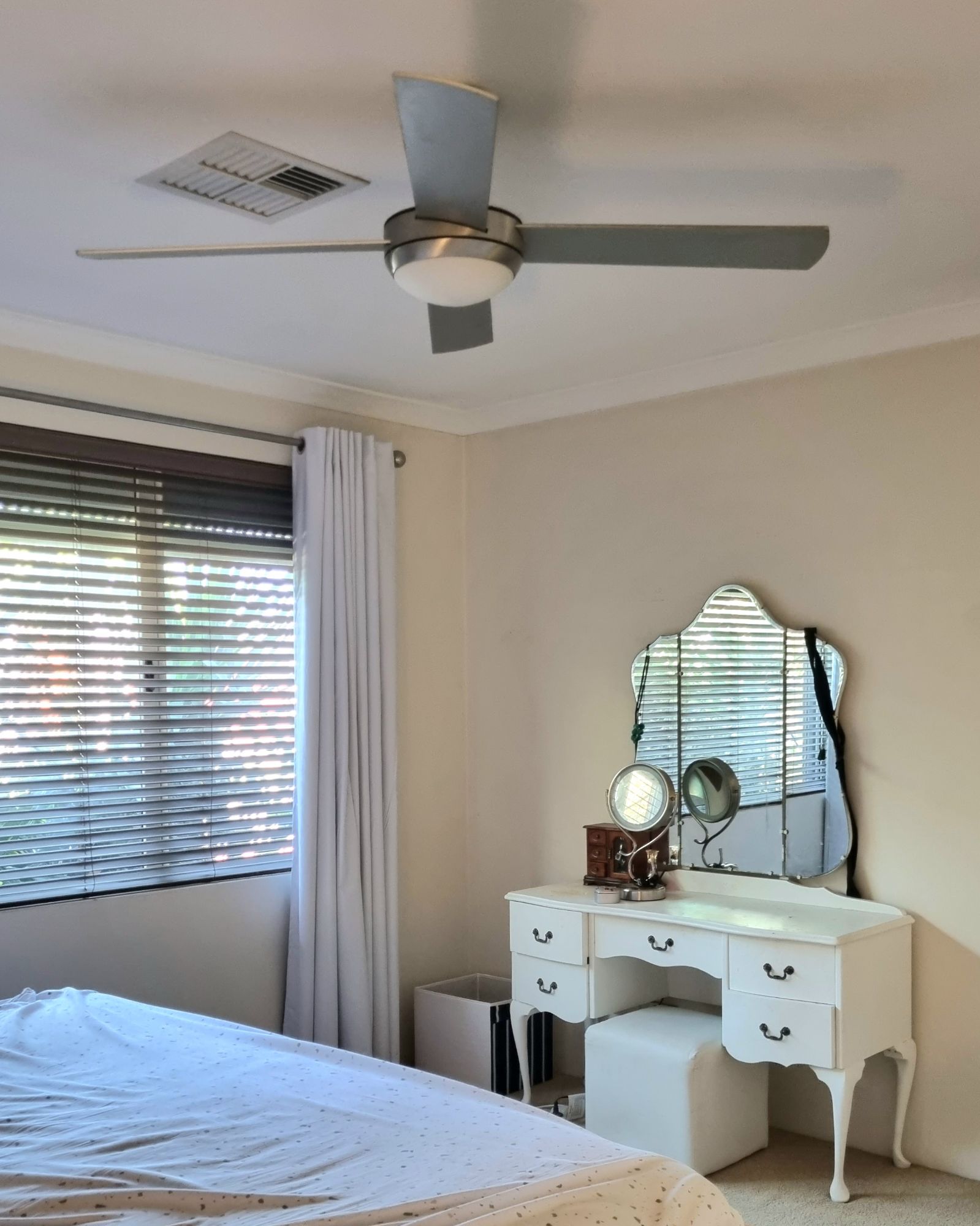 Just like the air-con vent, we didn’t want the ceiling fan to stand out. So we donated the chrome fan that was already in the room and replaced it with a black fan from Beacon Lighting.