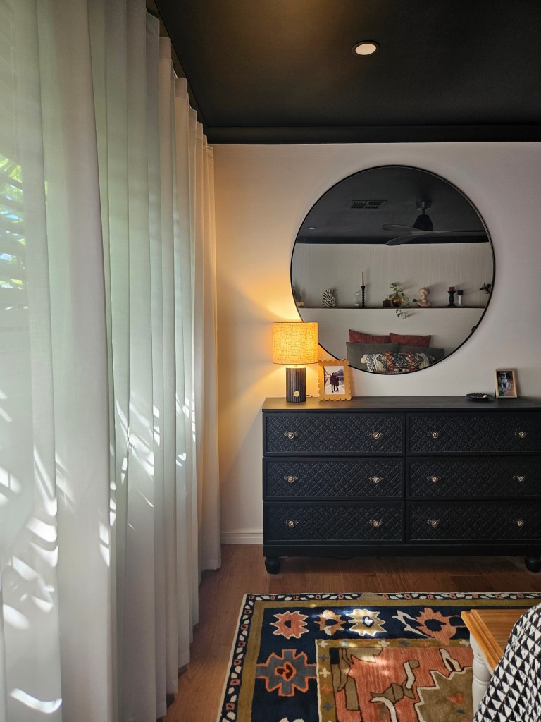 For the mirror, I was looking for something almost as wide as the dresser. I found a simple big 900mm round mirror on Marketplace for the bargain price of $50. It was a factory second since there’s a smudge on it that can’t be removed, but you can barely see it! It might be more noticeable in a bathroom, but in here, I literally never notice it.