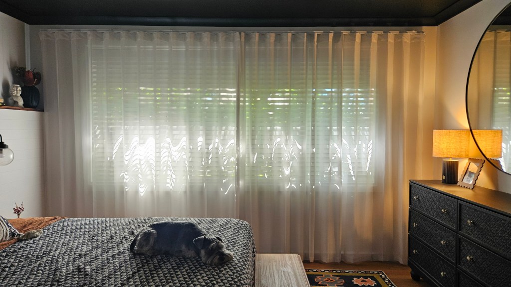 Our curtains are S-fold curtains on a track, so the folds are always beautifully spaced and wavy. The sheer fabric lets in so much light and since we have venetian blinds and roller blinds, we didn’t need the curtains to be heavy.