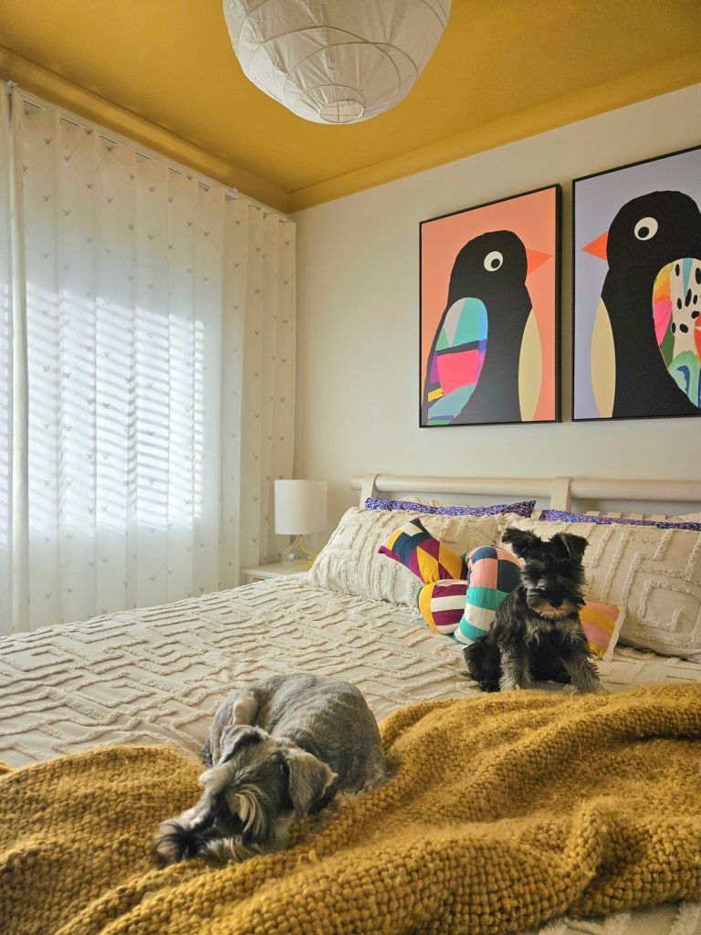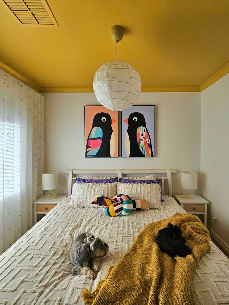 In our guest room, we’ve repeated the mustard yellow in our ceiling via the throw blanket, cushion, and subtle yellow hints in the curtains and lamp cords 💛
