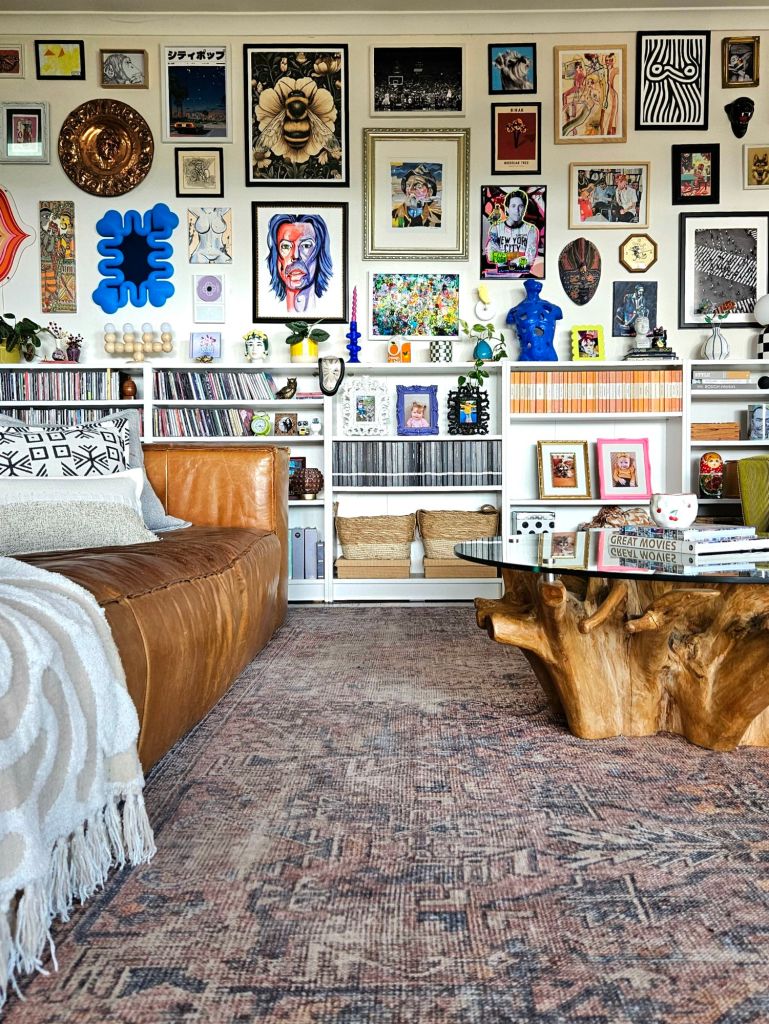 If you’ve got a boxy sofa, pair it with a round or oval coffee table. Or, if you have a gallery wall, incorporate a few rounded items like a clock and a mirror to break up the sharp lines.